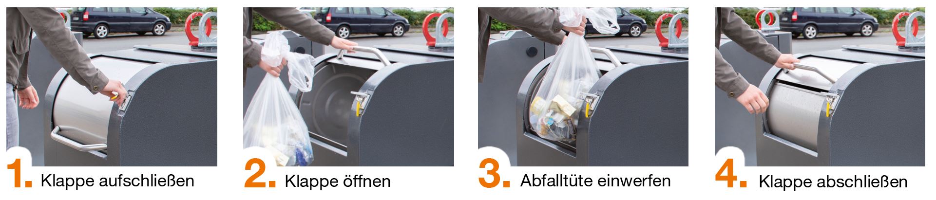 Die Unterflurbehälter für die verschiedenen Abfallfraktionen sind barrierefrei zugänglich und einfach zu bedienen. Jeder Mieter erhält einen Schlüssel für den Einwurfschacht, in dem er Restmüll und Wertstoffe bequem entsorgen kann. Am Abfuhrtag hebt ein Spezialfahrzeug die gesamte Einheit mit einem Kran über die Ladefläche des Entsorgungsfahrzeugs und entleert den Behälter. Bis dahin lagert der Abfall unsichtbar im Untergrund.